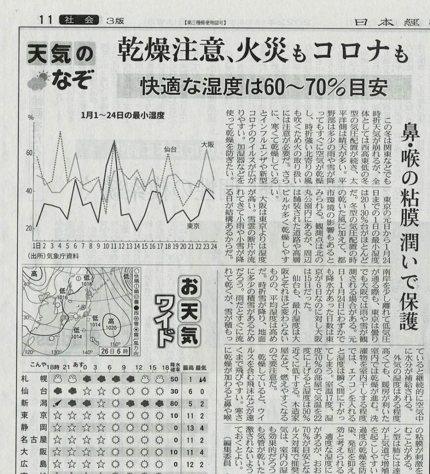 1月26日の日本経済新聞の夕刊社会面「天気のなぞ」の記事が、的を射ています。日経らしくないのですが、とても重要な記事です。手洗い、うがい、消毒という対策に加えて、粘膜の保護という視点をもっと強調するべきだからです。