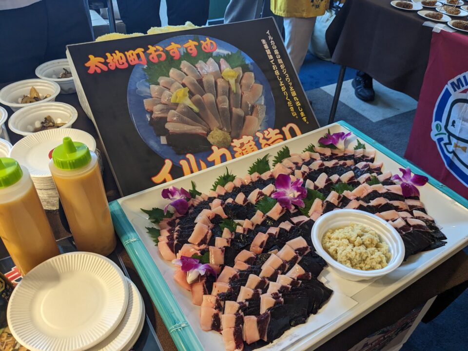 いつも大人気でなくなってしまうのが、太地町さんが提供するイルカの薄切り刺身とすき焼きです。